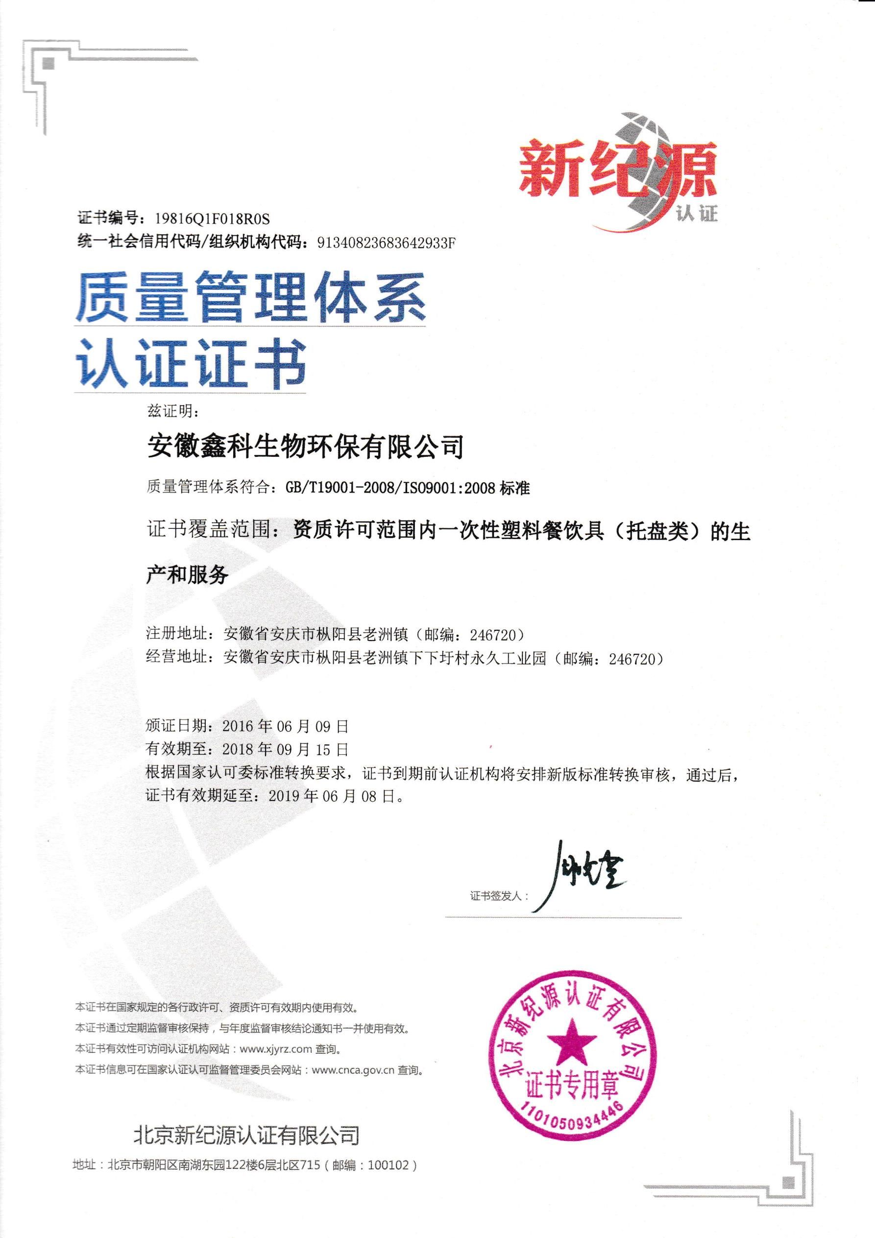 質(zhì)量管理體系證書(shū)